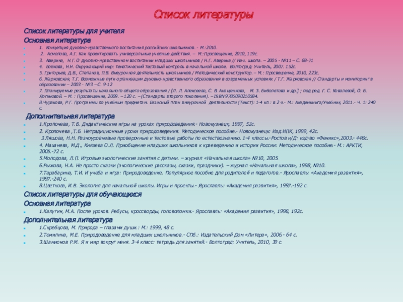 1.Кропочева, Т.Б. Дидактические игры на уроках природоведения.- Новокузнецк, 1997, 52с.