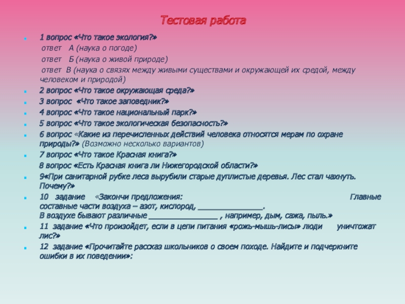 вопросы тестовой работы, а также результаты непосредственных наблюдений за поведением детей в природе, их взаимоотношений с ней.
