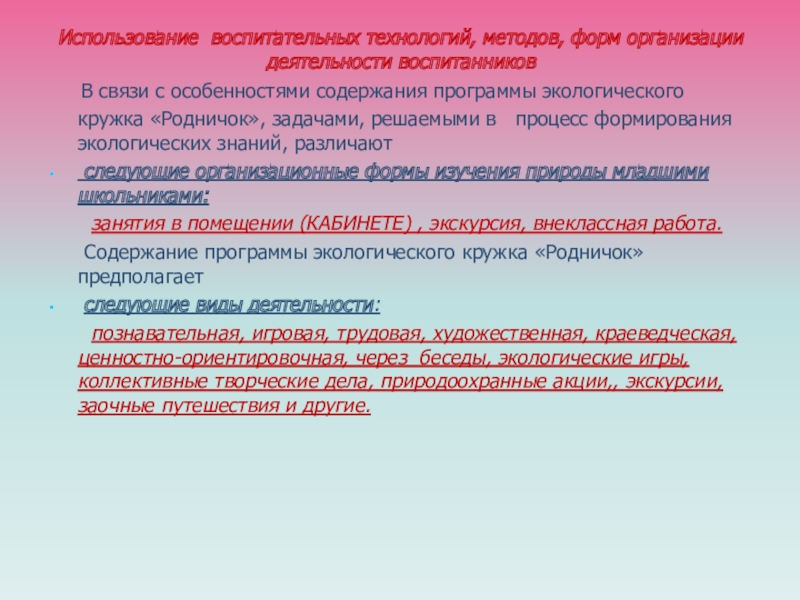 с особенностями содержания программы экологического кружка «Родничок», задачами, решаемыми в процесс формирования экологических знаний, различают
