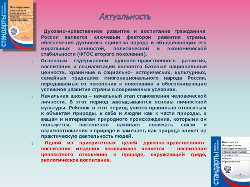 развития страны, обеспечения духовного единства народа и объединяющих его моральных ценностей, политической и экономической стабильности (ФГОС второго поколения).