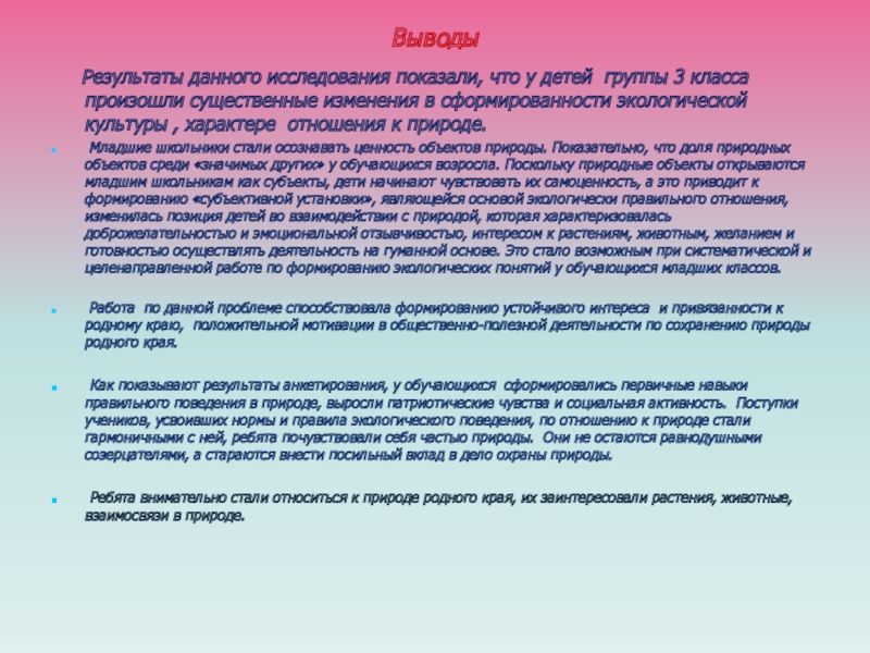 Младшие школьники стали осознавать ценность объектов природы. Показательно, что доля природных объектов среди «значимых других» у обучающихся возросла. Поскольку природные объекты открываются младшим школьникам как субъекты, дети начинают чувствовать их самоценность, а это приводит к формированию «субъективной установки», являющейся основой экологически правильного отношения, изменилась позиция детей во взаимодействии с природой, которая характеризовалась доброжелательностью и эмоциональной отзывчивостью, интересом к растениям, животным, желанием и готовностью осуществлять деятельность на гуманной основе. Это стало возможным при систематической и целенаправленной работе по формированию экологических понятий у обучающихся младших классов.