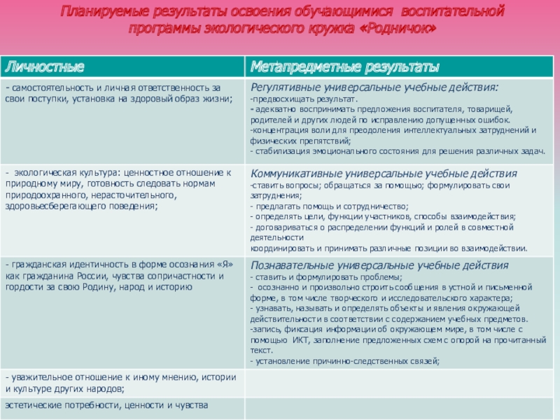 Планируемые результаты освоения обучающимися воспитательной программы экологического кружка «Родничок»