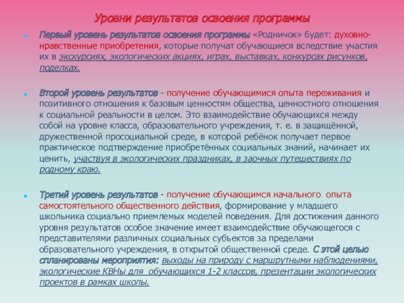 Первый уровень результатов освоения программы «Родничок» будет: духовно-нравственные