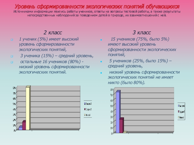 15 учеников (75%, было 5%) имеют высокий уровень сформированности экологических понятий,