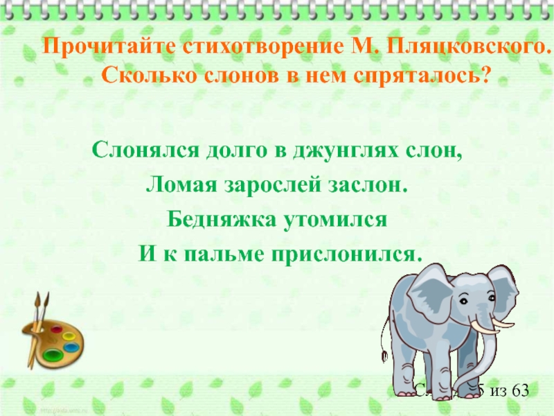 Прочитайте стихотворение М. Пляцковского. Сколько слонов в нем спряталось?