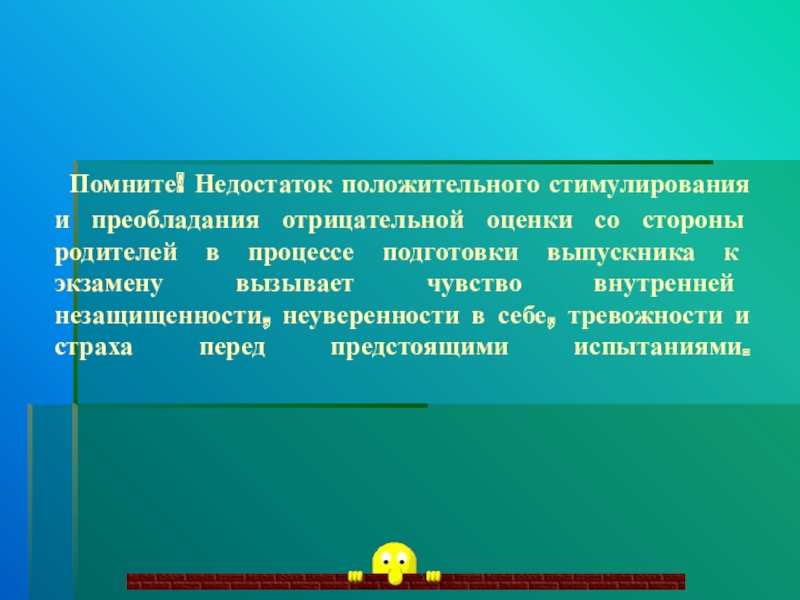родителей в процессе подготовки выпускника к экзамену вызывает чувство внутренней незащищенности, неуверенности в себе, тревожности и страха перед предстоящими испытаниями.