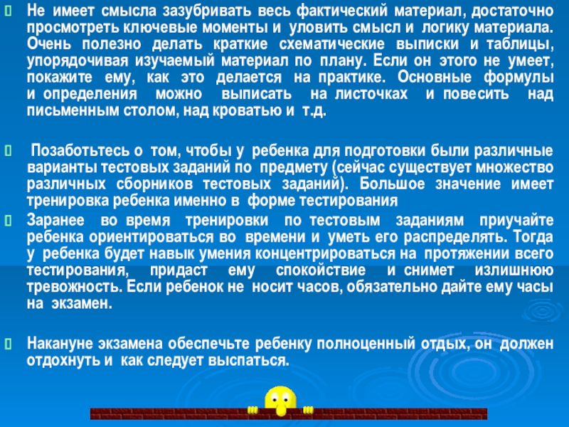 Слайд 12Не имеет смысла зазубривать весь фактический материал, достаточно просмотреть ключевые моменты и уловить