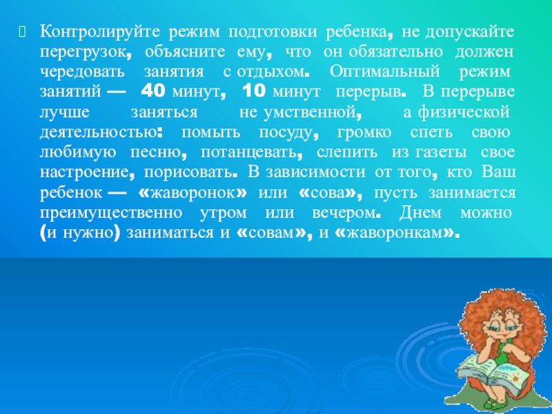 чередовать занятия с отдыхом. Оптимальный режим занятий — 40 минут, 10 минут перерыв. В перерыве лучше заняться не умственной, а физической деятельностью: помыть посуду, громко спеть свою любимую песню, потанцевать, слепить из газеты свое настроение, порисовать. В зависимости от того, кто Ваш ребенок — «жаворонок» или «сова», пусть занимается преимущественно утром или вечером. Днем можно (и нужно) заниматься и «совам», и «жаворонкам».