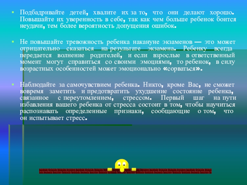 Не повышайте тревожность ребенка накануне экзаменов — это может отрицательно сказаться на результате экзамена. Ребенку всегда передается волнение родителей, и если взрослые в ответственный момент могут справиться со своими эмоциями, то ребенок, в силу возрастных особенностей может эмоционально «сорваться».