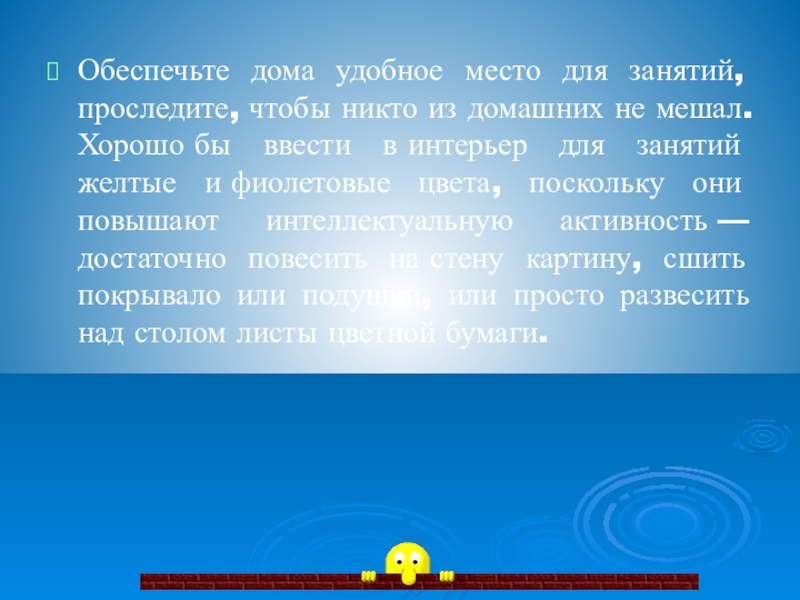Хорошо бы ввести в интерьер для занятий желтые и фиолетовые цвета, поскольку они повышают интеллектуальную активность — достаточно повесить на стену картину, сшить покрывало или подушки, или просто развесить над столом листы цветной бумаги.