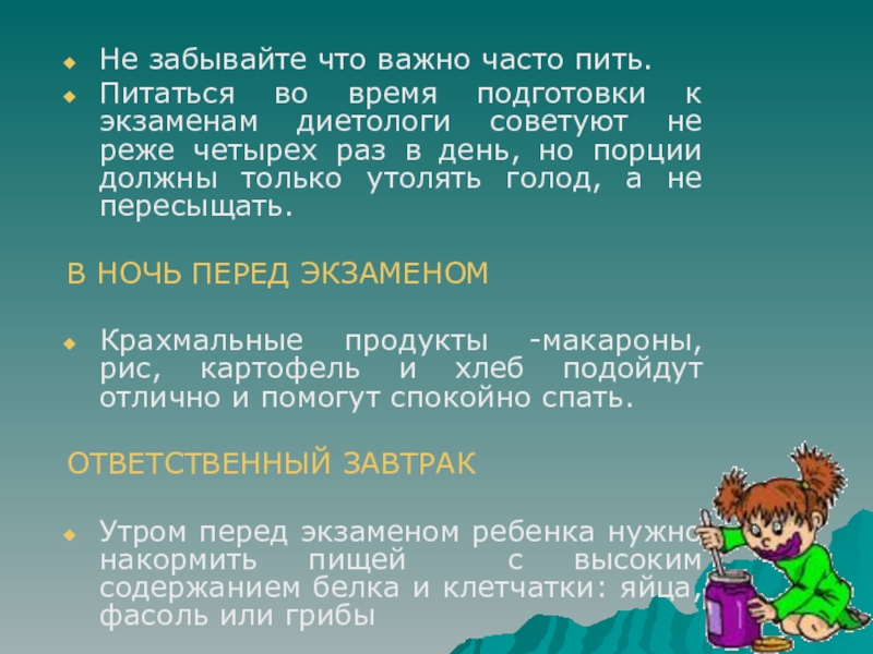 Накануне экзамена обеспечьте ребенку полноценный отдых, он должен отдохнуть и как следует выспаться.