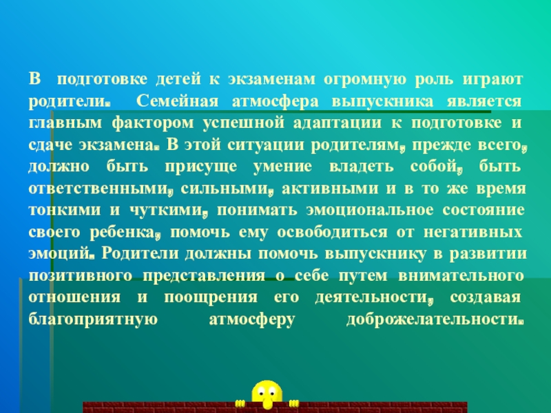Слайд 3В подготовке детей к экзаменам огромную роль играют родители. Семейная атмосфера