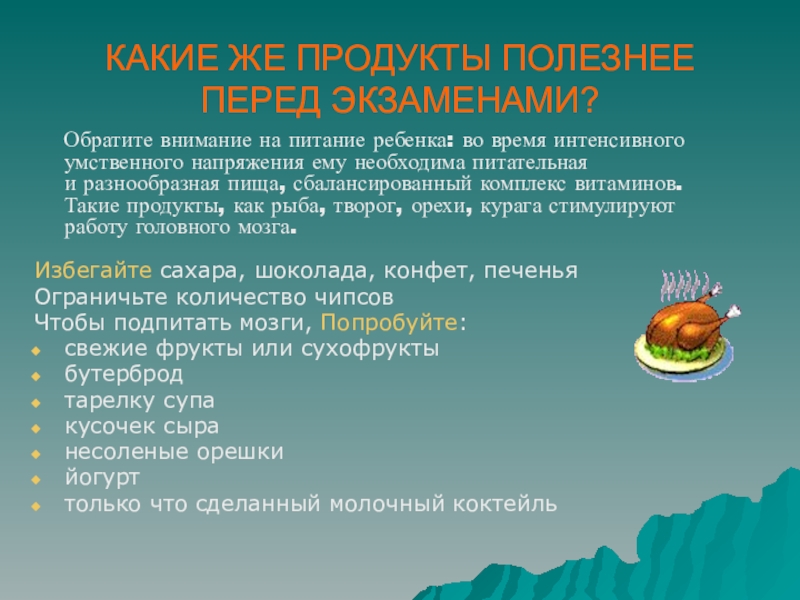 Слайд 13КАКИЕ ЖЕ ПРОДУКТЫ ПОЛЕЗНЕЕ ПЕРЕД ЭКЗАМЕНАМИ?