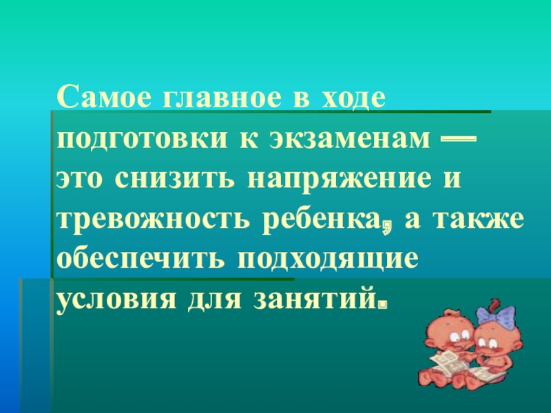 Слайд 6Самое главное в ходе подготовки к экзаменам — это снизить напряжение