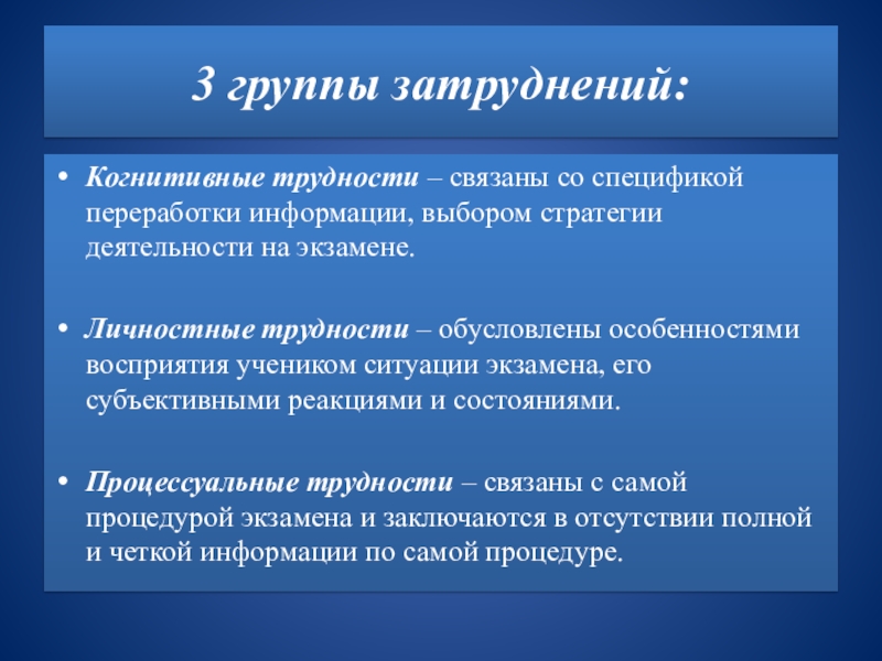 Личностные трудности – обусловлены особенностями восприятия учеником ситуации экзамена, его субъективными реакциями и состояниями.