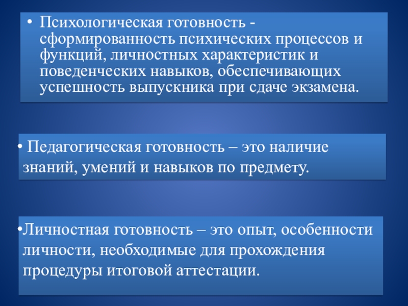 Личностная готовность – это опыт, особенности личности, необходимые для прохождения процедуры итоговой аттестации.