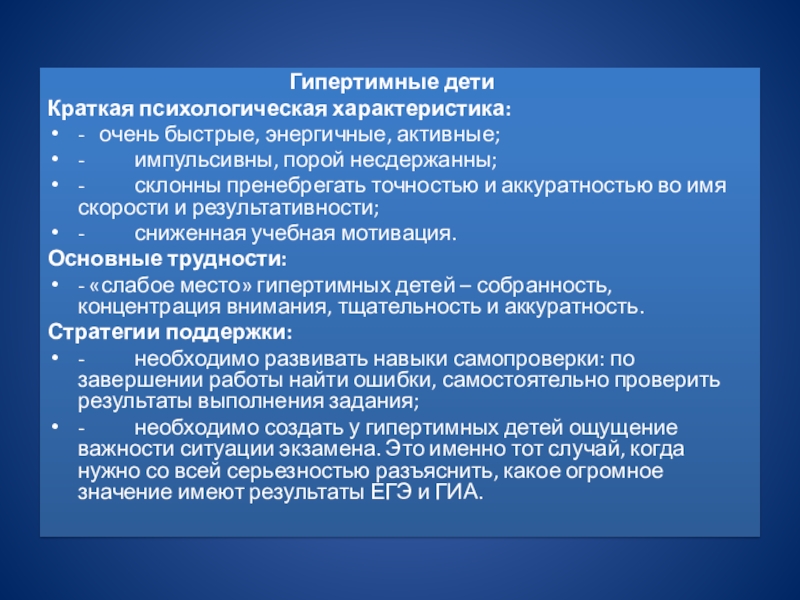 - «слабое место» гипертимных детей – собранность, концентрация внимания, тщательность и аккуратность.