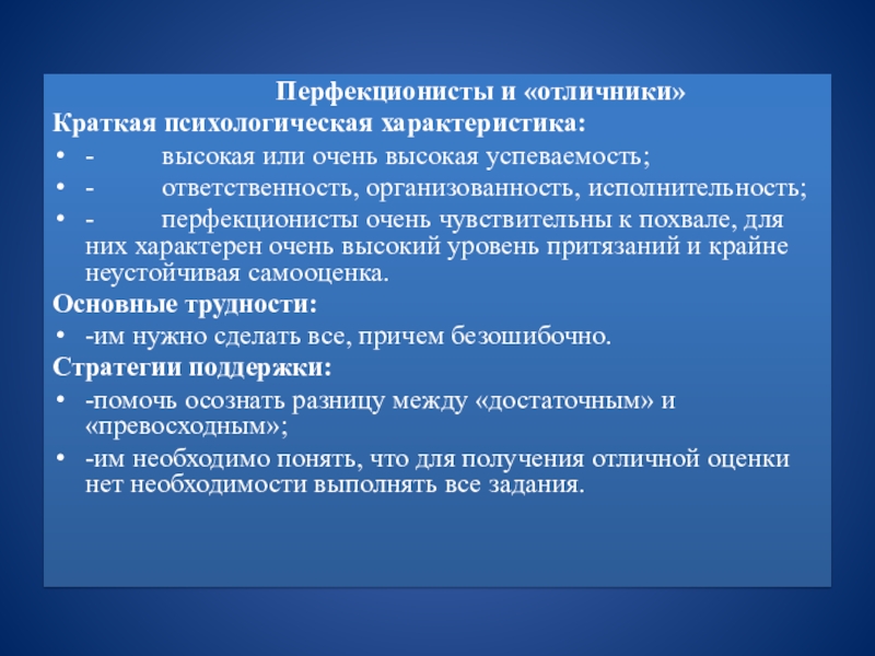 уровнем притязаний, неустойчивой самооценкой, так называемые перфекционисты или «отличники»;