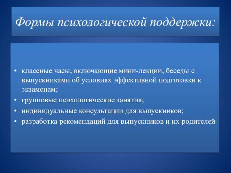 Слайд 9Формы психологической поддержки: