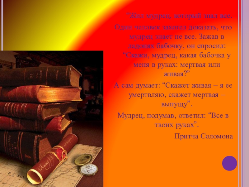 знает не все. Зажав в ладонях бабочку, он спросил: “Скажи, мудрец, какая бабочка у меня в руках: мертвая или живая?”