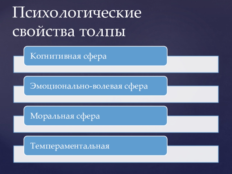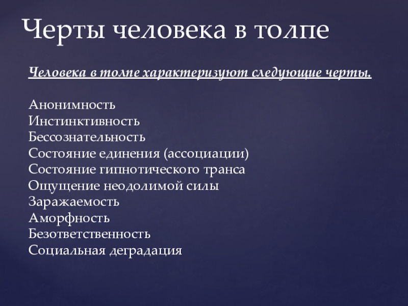 Черты человека в толпеЧеловека в толпе характеризуют следующие черты. АнонимностьИнстинктивностьБессознательностьСостояние единения (ассоциации)Состояние гипнотического трансаОщущение неодолимой силыЗаражаемостьАморфностьБезответственностьСоциальная деградация