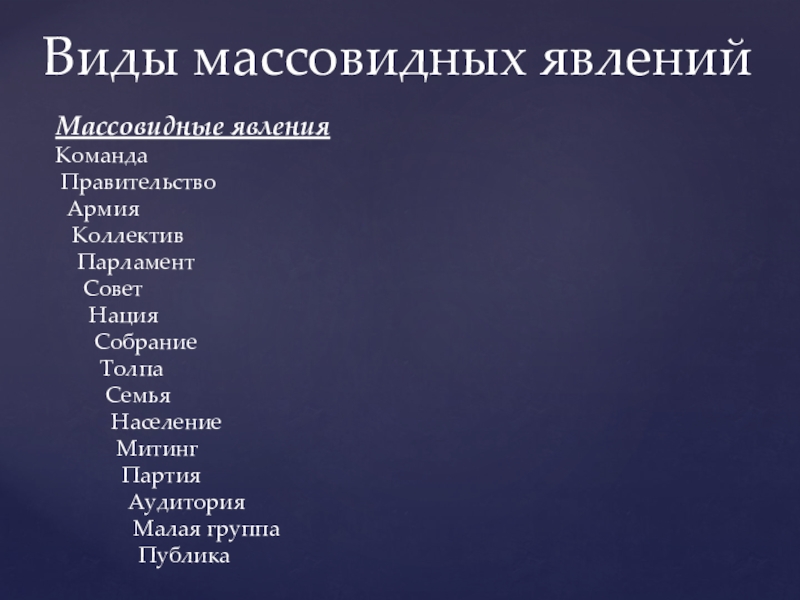 Виды массовидных явленийМассовидные явленияКоманда Правительство Армия  Коллектив  Парламент   Совет   Нация