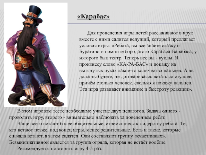 Для проведения игры детей рассаживают в круг, вместе с ними садится ведущий, который предлагает условия игры: «Ребята, вы все знаете сказку о Буратино и помните бородатого Карабаса-Барабаса, у которого был театр. Теперь все вы - куклы. Я произнесу слово «КА-РА-БАС» и покажу на вытянутых руках какое-то количество пальцев. А вы должны будете, не договариваясь встать со стульев, причём столько человек, сколько я покажу пальцев. Эта игра развивает внимание и быстроту реакции».