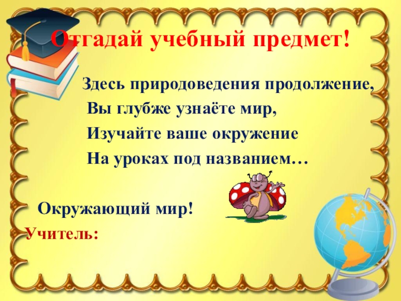Отгадай учебный предмет!       Здесь природоведения продолжение,