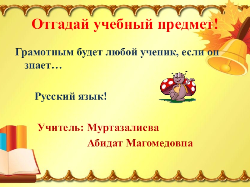 Отгадай учебный предмет!Грамотным будет любой ученик, если он знает…    Русский язык!