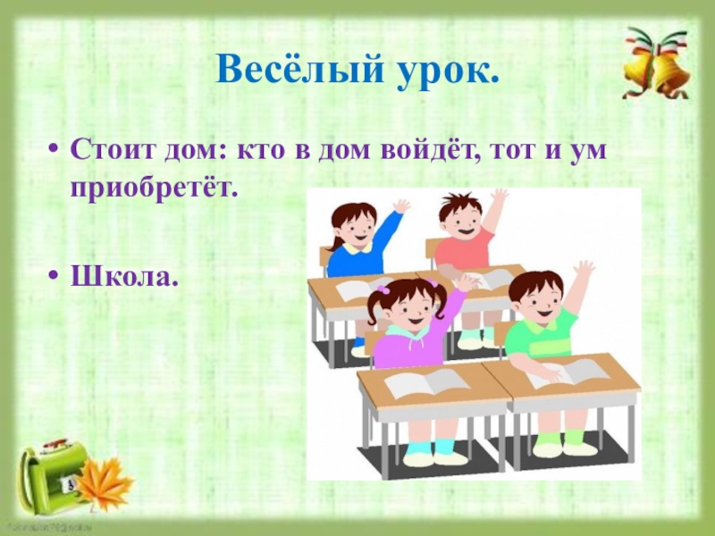 Весёлый урок.Стоит дом: кто в дом войдёт, тот и ум приобретёт.Школа.