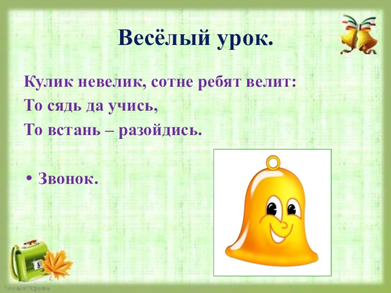 Весёлый урок.Кулик невелик, сотне ребят велит:То сядь да учись,То встань – разойдись.Звонок.