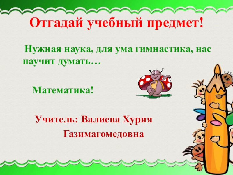 Отгадай учебный предмет!  Нужная наука, для ума гимнастика, нас    научит думать…