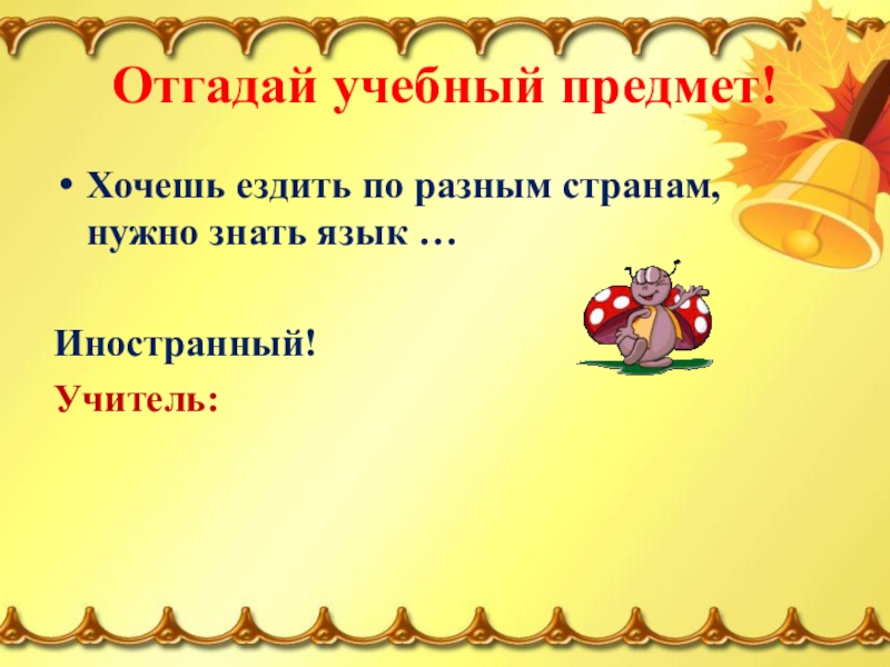 Отгадай учебный предмет!Хочешь ездить по разным странам, нужно знать язык …    Иностранный!Учитель: