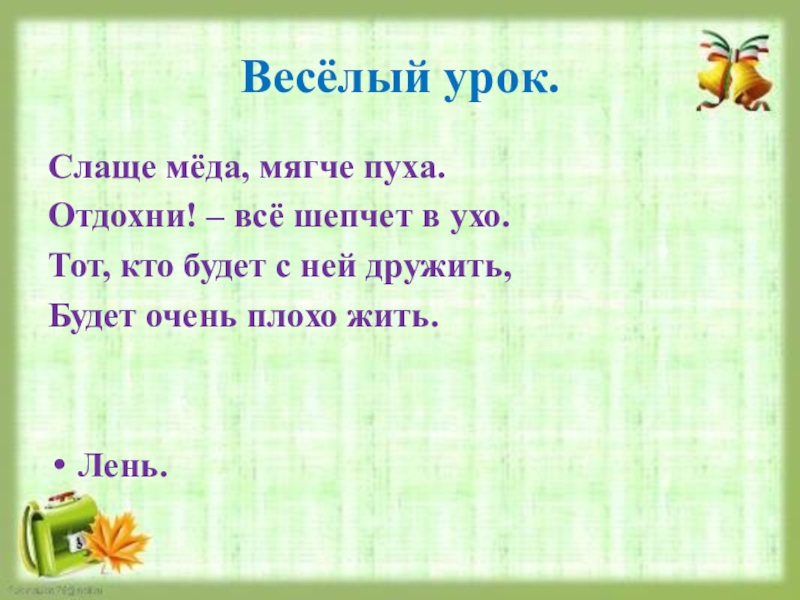 Весёлый урок.Слаще мёда, мягче пуха.Отдохни! – всё шепчет в ухо.Тот, кто будет с ней дружить,Будет очень плохо