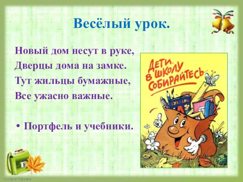 Весёлый урок.Новый дом несут в руке, Дверцы дома на замке.Тут жильцы бумажные, Все ужасно важные.Портфель и учебники.