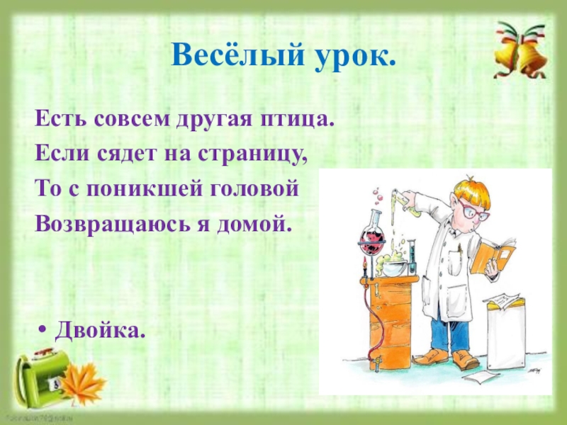 Весёлый урок.Есть совсем другая птица.Если сядет на страницу,То с поникшей головойВозвращаюсь я домой.Двойка.