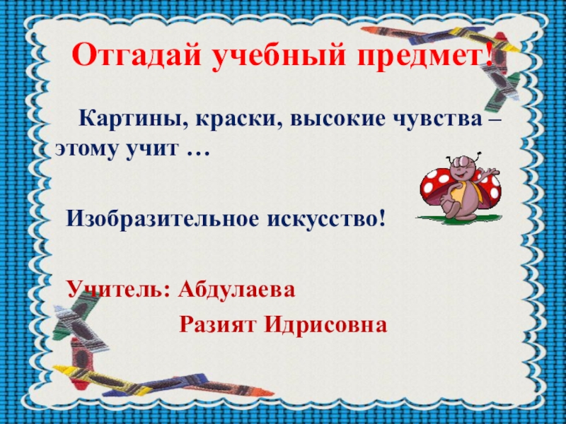 Отгадай учебный предмет!    Картины, краски, высокие чувства –   этому учит …