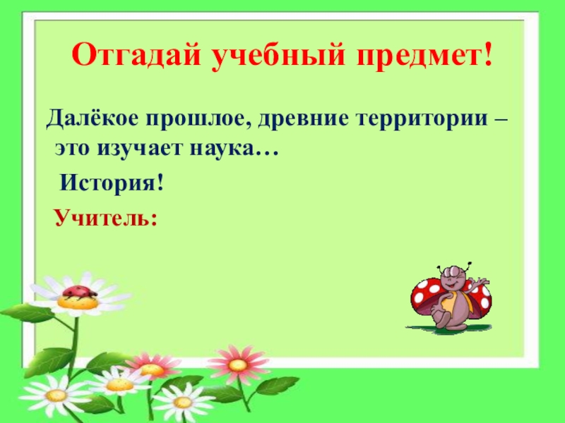Отгадай учебный предмет! Далёкое прошлое, древние территории – это изучает наука…  История!  Учитель:
