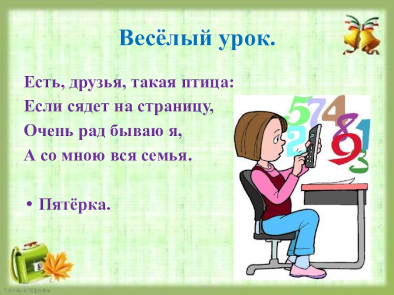 Весёлый урок.Есть, друзья, такая птица:Если сядет на страницу,Очень рад бываю я, А со мною вся семья.Пятёрка.