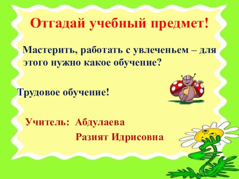 Отгадай учебный предмет!  Мастерить, работать с увлеченьем – для этого нужно какое обучение? Трудовое обучение!