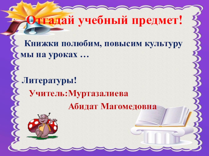 Отгадай учебный предмет!   Книжки полюбим, повысим культуру  мы на уроках …   Литературы!