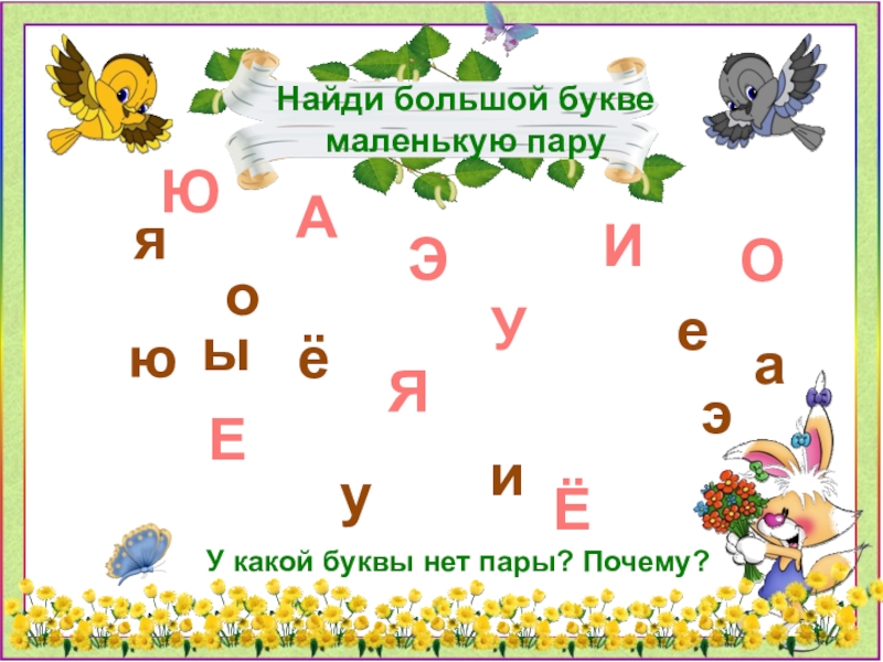 Найди большой буквемаленькую паруяАЭИОюёоУыеаЕЯЮуиЁэУ какой буквы нет пары? Почему?