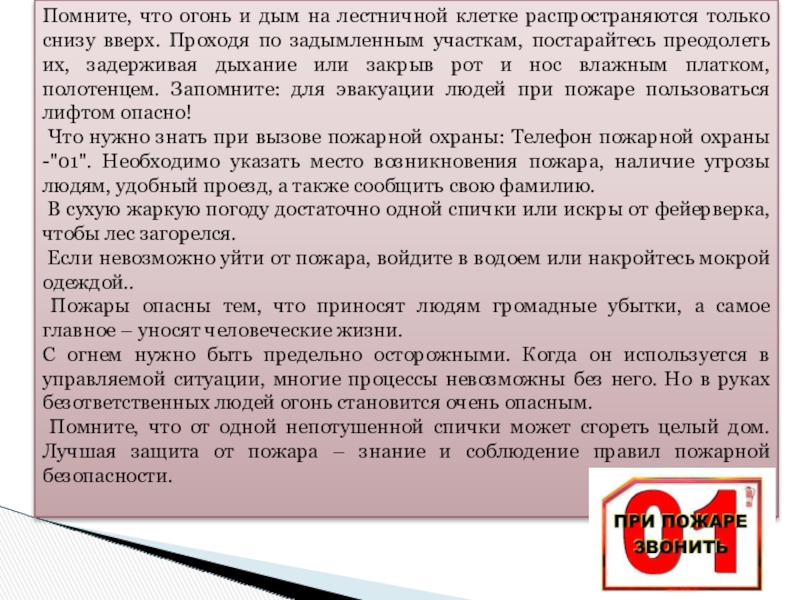 Что нужно знать при вызове пожарной охраны: Телефон пожарной охраны -"01". Необходимо указать место возникновения пожара, наличие угрозы людям, удобный проезд, а также сообщить свою фамилию.