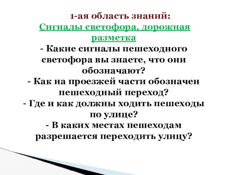 1-ая область знаний: Сигналы светофора, дорожная разметка- Какие сигналы пешеходного светофора вы знаете, что они обозначают?- Как на
