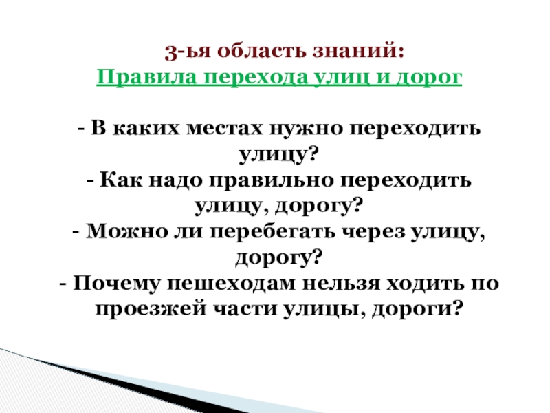 Слайд 11  3-ья область знаний:  Правила перехода улиц и дорог