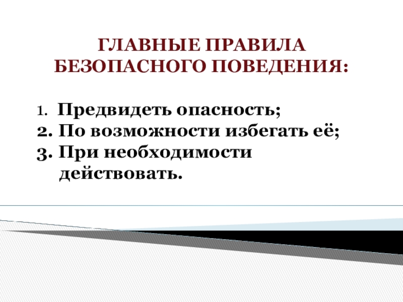 ГЛАВНЫЕ ПРАВИЛА БЕЗОПАСНОГО ПОВЕДЕНИЯ:   1. Предвидеть опасность;  2. По возможности избегать её; 3. При необходимости действовать.