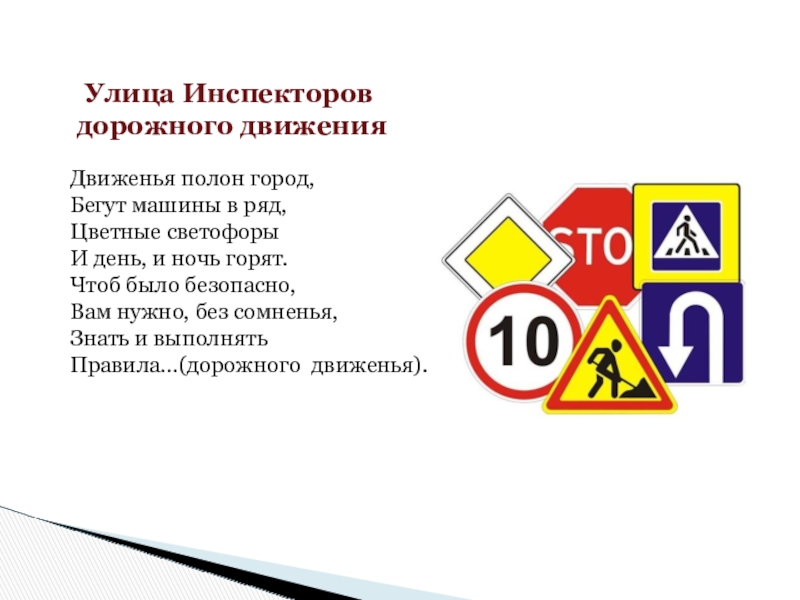 Улица Инспекторов дорожного движенияДвиженья полон город,Бегут машины в ряд,Цветные светофорыИ день, и ночь горят.Чтоб было