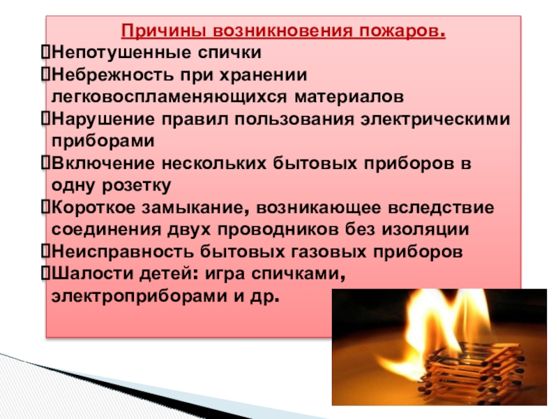 Причины возникновения пожаров.Непотушенные спички Небрежность при хранении легковоспламеняющихся материалов Нарушение правил пользования электрическими приборами Включение нескольких бытовых