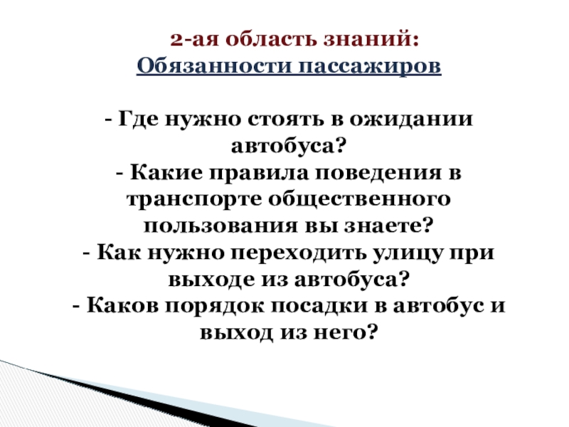 2-ая область знаний: Обязанности пассажиров- Где нужно стоять в ожидании автобуса?- Какие правила поведения в транспорте общественного пользования