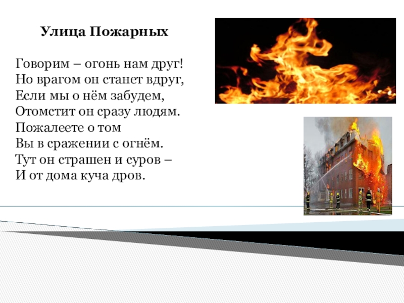 Улица Пожарных Говорим – огонь нам друг! Но врагом он станет вдруг, Если мы о